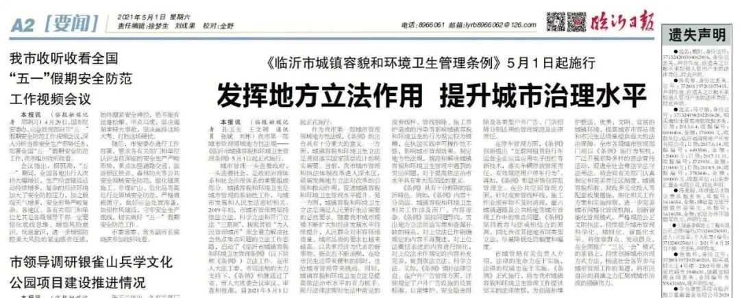 临沂日报解读:我市第一部城市管理领域地方性法规——《临沂市城镇容貌和环境卫生管理条例》5月1日起正式施行。
