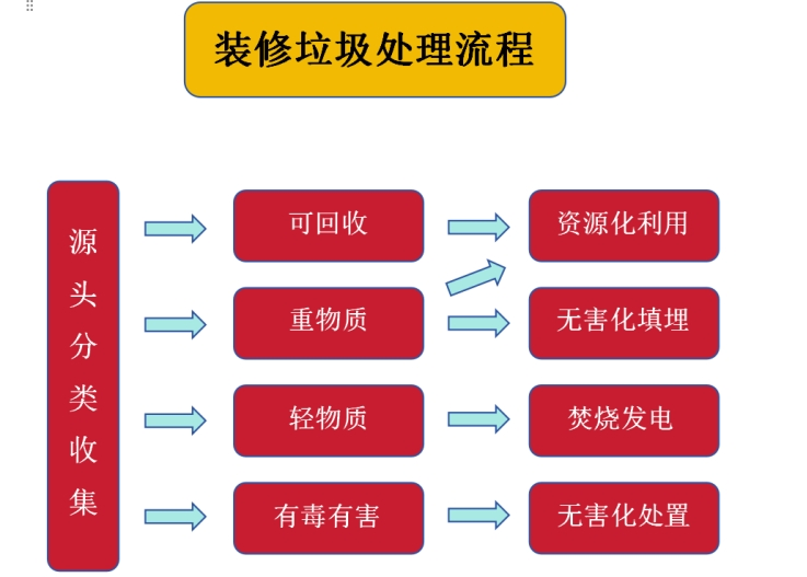 装修垃圾的分类应按照照轻物质类(有机物,包括纸质、木质、塑料等)和重物质类(无机物,包括轻质砖、瓷砖、混凝土块、石膏板、腻子粉、金属等)进行分类收集。